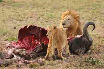 ESSA IMAGEM MOSTRA UM LEÃO CONSUMINDO UMA GIRAFA FILHOTE .